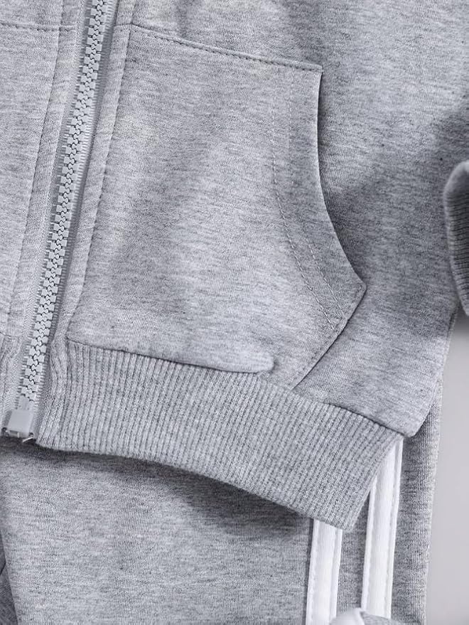 Material: fleece Winter Wear Package includes: 1× Jacket +1× Joggers Breathable, soft and skin-friendly fabric, comfy wearing feel for kids Unisex kids 2 pieces suit: Long sleeves zipper jacket + Elastic waist band jogger sweat pants Occasion: casual everyday, jogging, running, sportswear, playwear and home wear etc. 5-6 Year