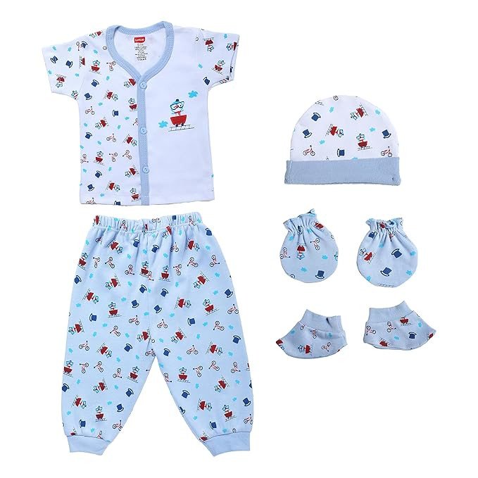 Newborn Baby Cotton Gift Set Of 5 Items, Open Half Sleeves Jhabla Vest- Tshirt, Pyjama, Cap, Mittens & Socks, Baby Clothes Set 0-3 Months