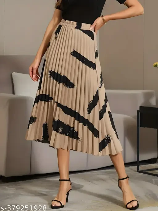 Brush Print Pleated Skirts, Vintage Elastic Waist Midi Skirts, Women's Clothing(Premium Quality)