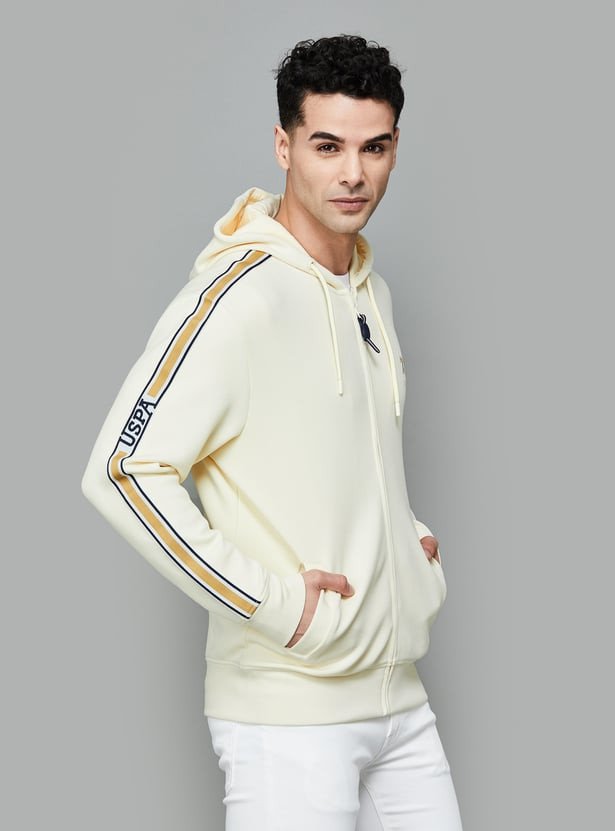 Elevate your urban style with this hooded sweatshirt featuring a front zip closure, full sleeves with ribbed cuffs, and a distinctivemstripe design on the sleeves. The ribbed hemline adds a touch of comfort, making it a versatile and trendy addition to your wardrobe.