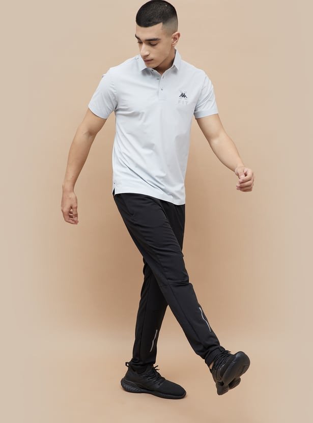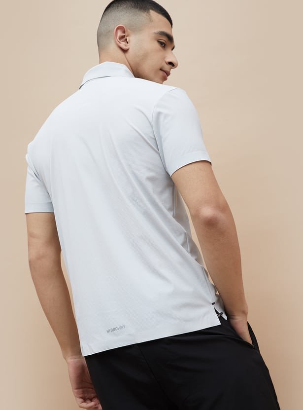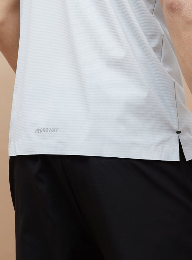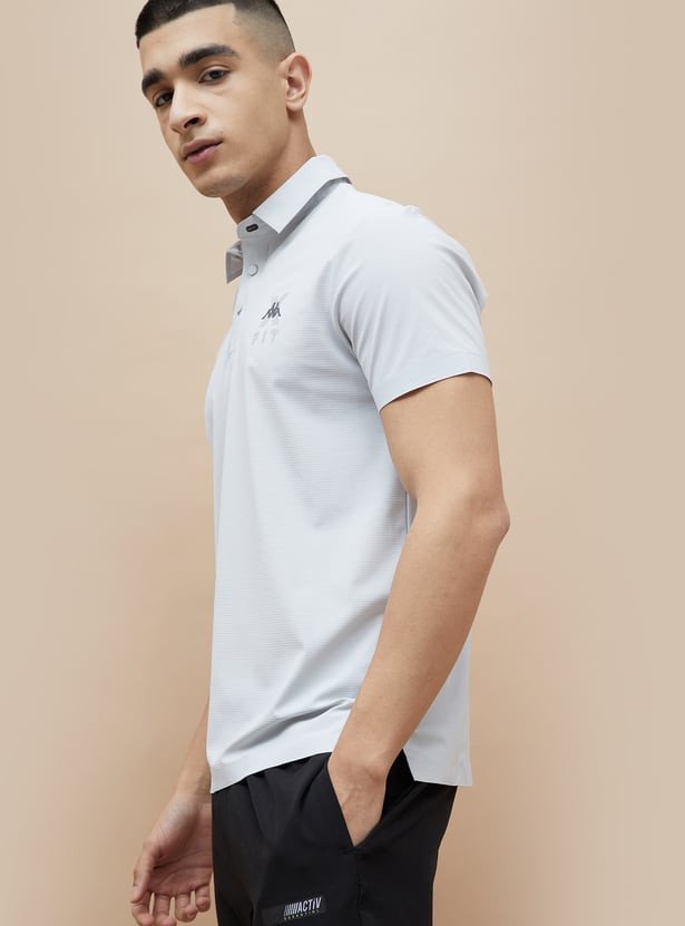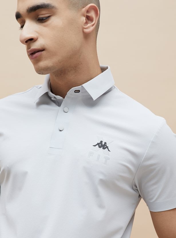 Gear up for your workout in this T-shirt. The tonal checks add to the style. It has a polo collar, half sleeves, a logo on the chest, and side slits.