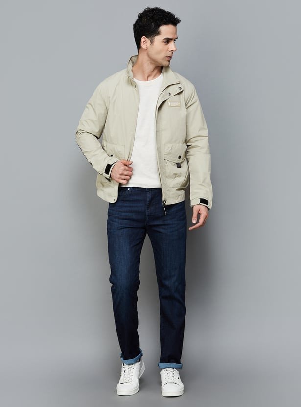 Look effortlessly stylish this winter season with this bomber jacket, designed with a printed surface, zip closure, pockets, and full sleeves. This jacket is also comprised of a button and Velcro closure that will keep you in sync with the fashion trend. The stand collar and shoulder straps keep the jacket at bay.
