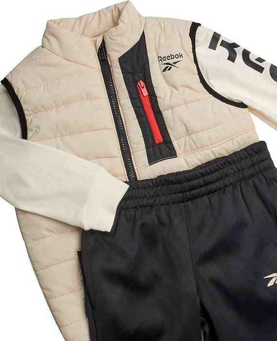 FUNCTIONAL STORAGE: This Reebok 3-piece vest set comes equipped with practical pockets in both the vest and jogger pants, providing your child with ample storage space for small essentials like snacks, toys, or gloves. The convenient pockets add an extra layer of functionality to this stylish and comfortable outfit, making it perfect for any adventure or outing.
