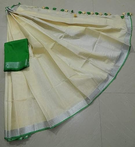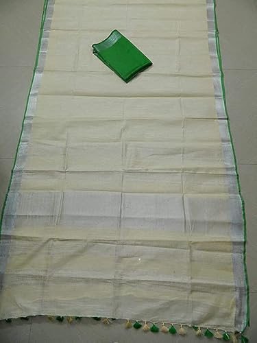 Saree Material : Cotton Linen Blend ; Design : Contrast Blouse Piece with Zari Border & Pallu Saree Length : 6.4 mts (0.9 mtr Blouse piece attached with saree) Disclaimer : Used Products are unchangeable & non-Refundable