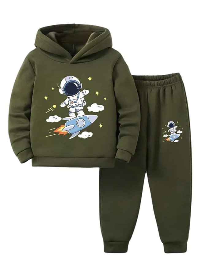 Astronaut on the Flying Rocket Printed Boys 2pcs Comfortable Long Sleeves Hoodie & Track Pants Set, Cozy Kids Clothing - Kids Outfit